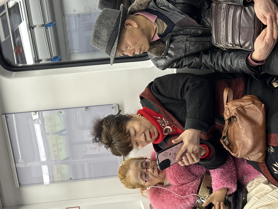 Three individuals ride public transit. An older man in a leather jacket and fedora sits with hands clasped on a leather bag. Below, two women are engrossed in a phone. One woman with reddish hair wears glasses and a pink fuzzy jacket, while the other in a black coat and red scarf points at the phone. A brown leather backpack hangs on the seat next to them. They are surrounded by the interior of the train.