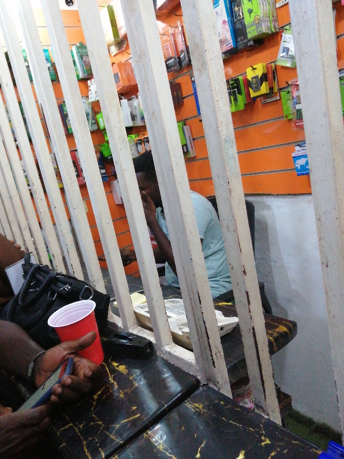 An eye-level indoor shot reveals a store with shelves stocked with phone accessories. A man sits behind a counter, appearing to be on the phone. The foreground is cluttered with a black bag, a red plastic cup, a black taser, and a hand holding a phone, all resting on a black and gold marble countertop. Vertical, worn white bars partially obscure the view, adding a sense of enclosure. The store's orange wall and displayed products create a backdrop that is both busy and indicative of a business.