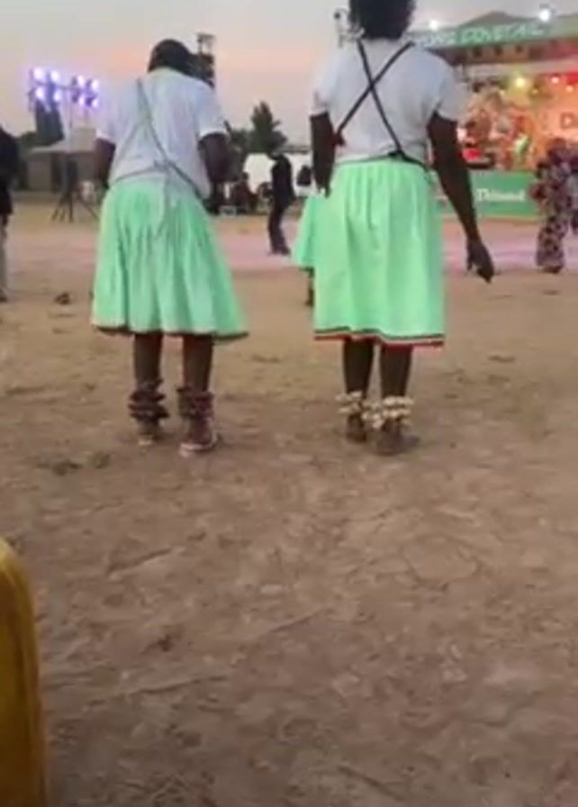 Two women are filmed from the back as they dance on packed earth. They wear white t-shirts, light green skirts with colored trim, and ankle ornaments on their bare legs. The skirts flare as they dance. Behind them, a crowd gathers around a stage with lights and a sign that reads, "DRAWING COVETAL 2022." A man in black clothing is walking in the distance. The scene appears to be an outdoor festival or gathering. The weather is overcast. A yellow container is to the left of the camera.