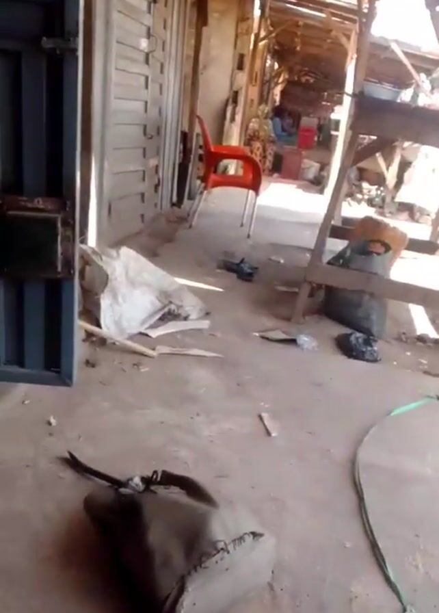 n outdoor area with some debris, including plastic, wood pieces, and a bag, scattered on a concrete floor. There is a red chair and a ladder-like structure in the background. Beyond that, the view opens to a wider outdoor space with a green van with a billboard on top. Two people are visible riding a motorcycle in the distance. The video appears to be taken from under a makeshift roof or shelter, providing a view out onto a somewhat cluttered outdoor area.