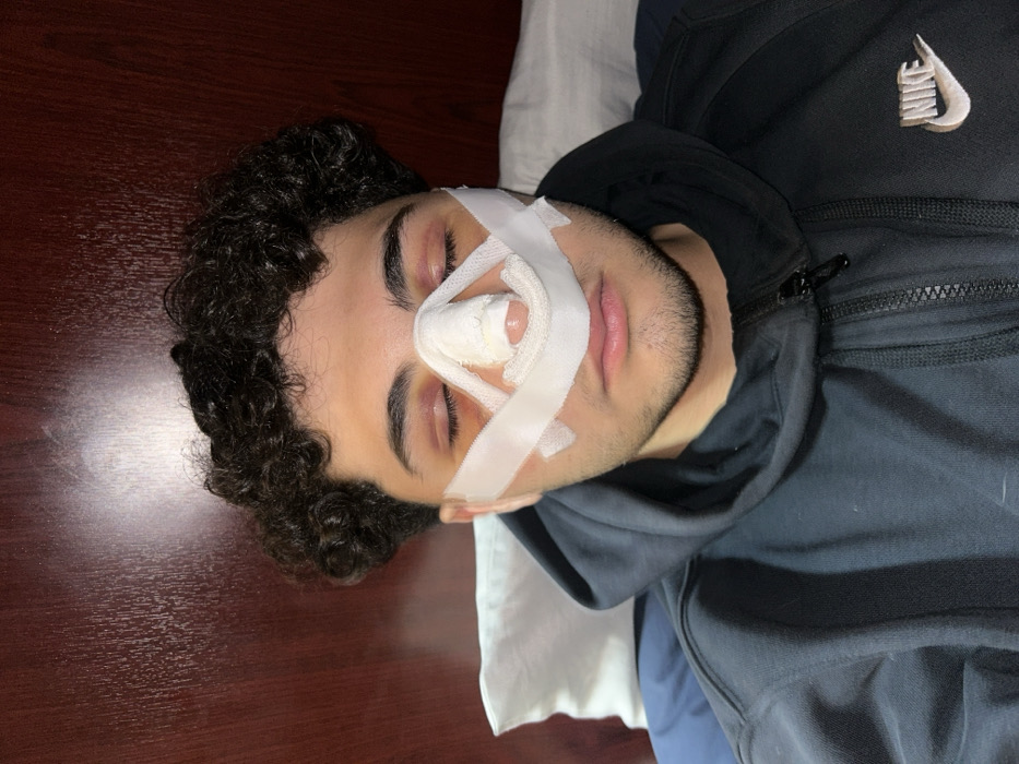 The scene depicts a young male individual, approximately late teens to early twenties, in what appears to be an indoor setting within Sarouja Municipality, Syria. He is positioned in a supine or semi-recumbent posture, resting against a white pillow and dark blue bedding. The individual has dark, curly hair and light facial stubble. His eyes are closed, and significant periorbital ecchymosis (bruising) is visible under both eyes, presenting as reddish-purple discoloration. A white nasal splint or cast is affixed to his nose, secured by white adhesive tape extending across the bridge of the nose and cheeks. White medical packing or dressing is visible beneath the splint at the nasal base. He is wearing a dark, zippered hooded sweatshirt with a white "NIKE" logo on the right chest area. The background consists of a dark reddish-brown, possibly wood-paneled, surface, likely a headboard or wall, with an apparent overhead light source casting a reflection. The overall appearance suggests a state of post-operative recovery or recent facial trauma.