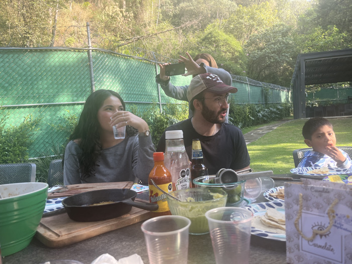 People are gathered outside. A woman drinks from a clear glass, while another woman stands behind a man and holds up a phone, seemingly taking a photo. A young boy sits at the table, eating. The table is cluttered with food, including a cast iron skillet, bowls of guacamole, bottles of condiments, and tortillas. The scene appears to be a casual outdoor gathering in a backyard with trees and a chain-link fence in the background.
