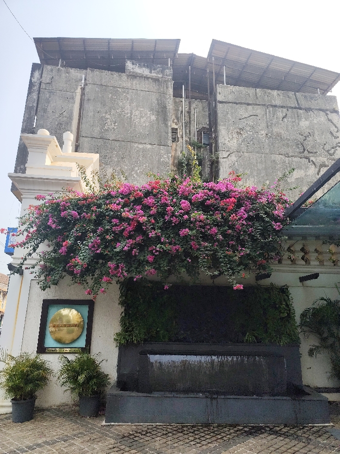 A building with a flat roof is partially obscured by a vibrant bougainvillea bush, which is pink and green. Below, a modern water feature has a dark, smooth stone frame and a backdrop of verdant plants. Two potted plants stand on the patterned pavement. To the left, a circular sign with gold lettering is visible. The building's weathered facade contrasts with the carefully curated garden elements.