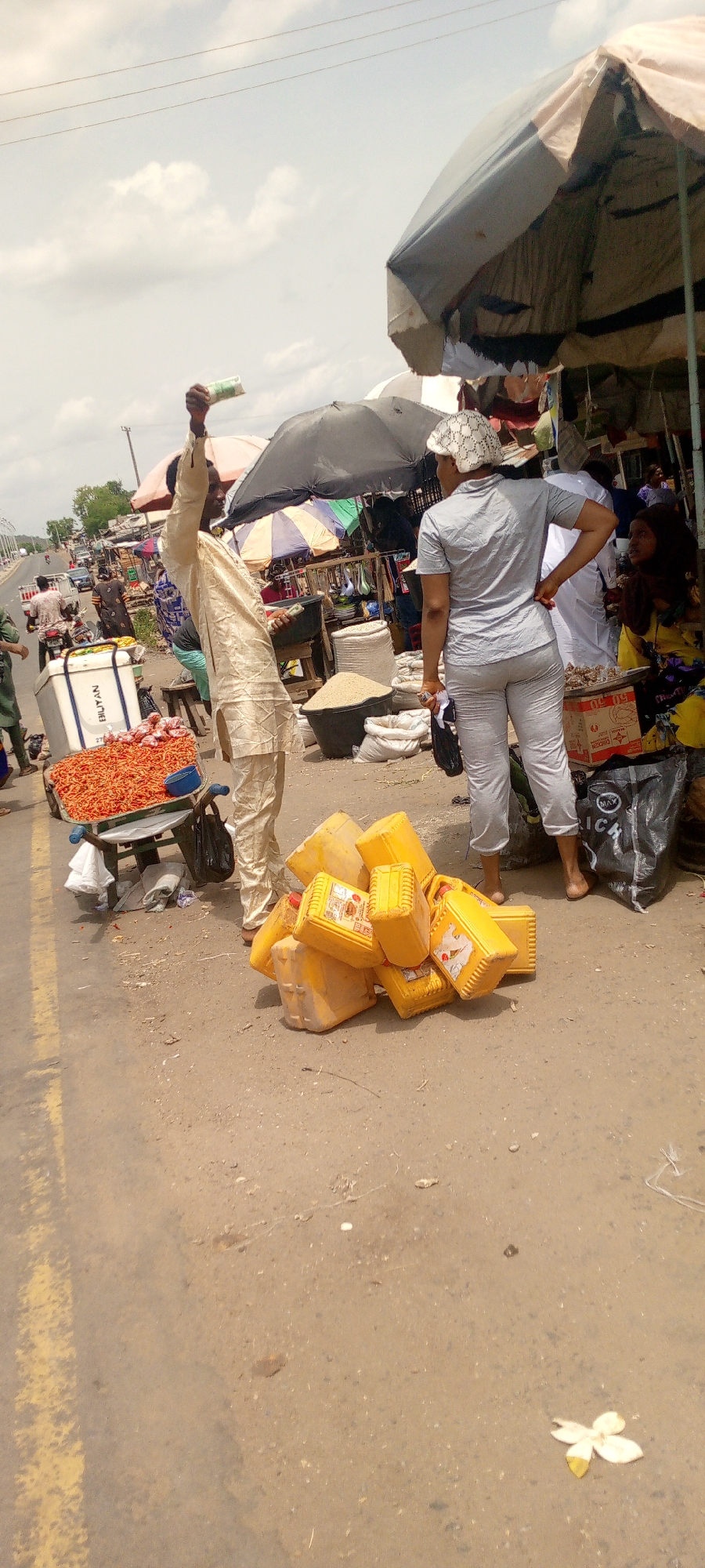 The image depicts a scene in Zango-ndaji, Nigeria, showing a roadside market
