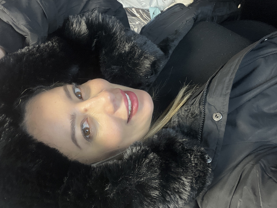 A person lies down, encircled by a puffy black jacket with faux fur trim around the hood. The individual has tan skin, with light blonde hair visible at the collar. The person is smiling, and their eyes are a light brown. A dark black garment is visible underneath the jacket, possibly a sweater. The lighting is bright, emphasizing the person's face.