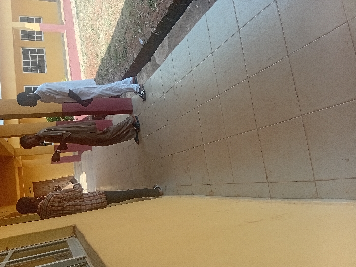This image captures a daytime scene on a tiled outdoor corridor or veranda of a building in Ayangba, Nigeria. The building features yellow-painted walls and columns. Three adult males are present on the light-colored tiled floor. On the left, one male, clad in a plaid shirt and dark trousers with dark sandals, stands with his back partially towards the camera, leaning against a yellow wall. He holds a small object with wires at waist height. In the center, a second male, wearing a loose-fitting brown or olive-colored garment and dark slippers, stands facing the first individual. His hands are raised, appearing to interact with or observe the object held by the first male. To the right, a third male, dressed in a white tunic and matching trousers with black and white striped slide sandals, stands facing away from the direct interaction, observing the area to his right. Beyond the tiled area, to the right, a strip of grass is visible, bordered by a low concrete curb. In the background, another two-story building, also painted yellow with a reddish-brown trim, features multiple windows with white frames. A partially visible wooden door is present on the yellow wall in the mid-background. The scene is brightly lit.