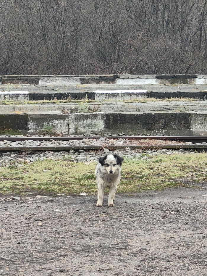 This image depicts an outdoor scene in the city of Dralfa, Bulgaria, under overcast conditions. The central subject is a small to medium-sized dog, presenting with a mottled white, grey, and black coat, dark ears, and dark markings around its eyes. The dog stands on a dark, wet gravel or dirt surface, facing directly towards the camera. Immediately behind the dog is a strip of sparsely vegetated ground with green grass and some dry weeds, leading to a set of railway tracks comprised of two rails on a bed of gravel ballast. Beyond the tracks, the background features a tiered concrete structure, possibly a disused platform or seating, with alternating sections painted black and white. The white sections exhibit patchy remnants of snow or ice. This structure shows signs of wear, dirt, and minor vegetative growth. Above and behind the concrete structure, a dense expanse of deciduous trees and shrubs, devoid of foliage, suggests a late autumn or winter setting. No other individuals or active elements are discernible in the frame.