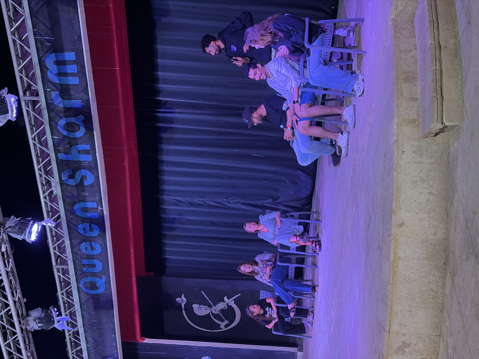 The image depicts a group of people sitting on metal chairs in front of a stage, at an outdoor entertainment venue identified by the sign "Queen Sharm", which refers to the city of Sharm El Sheikh, Egypt. There are three men in the foreground, and three women sitting behind them. The stage is set with a black curtain backdrop and a logo. Lighting fixtures are mounted on a truss structure to the left of the frame. The stage area is lit with a purple hue. The foreground is a paved walkway.