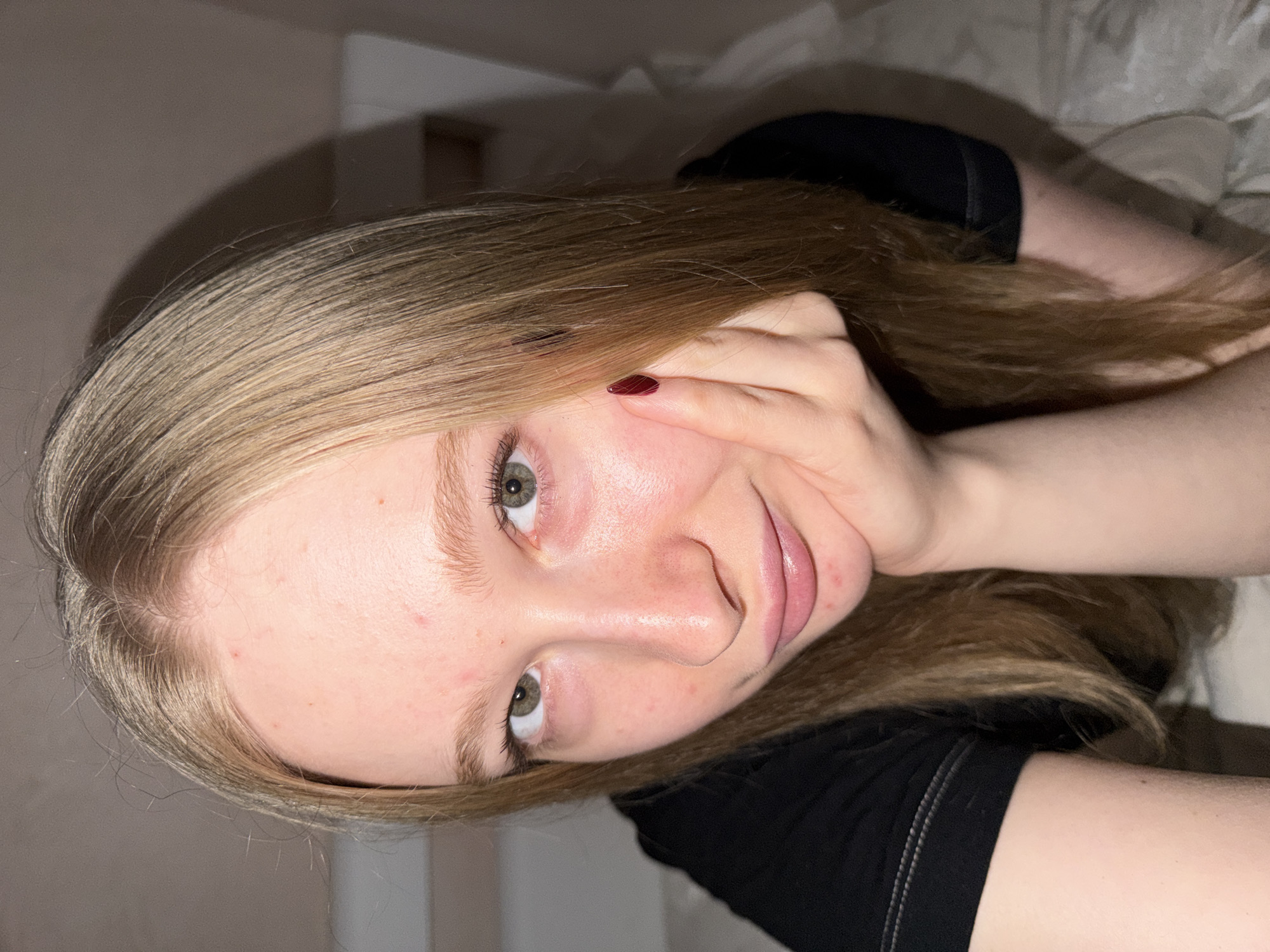 The scene is an indoor residential setting located in Rossiyskiy, Russia. A fair-skinned female subject with long, straight blonde hair and green eyes is depicted in a close-up shot, looking directly at the camera. She wears a black short-sleeved top. Her right hand is positioned with her chin resting on her knuckles; her right index finger, featuring an almond-shaped nail with dark red polish, is visible near her cheek. Minor skin blemishes are present on her forehead, cheeks, and chin. The background is indistinct, showing muted walls and a light-colored, textured surface, possibly bedding, in the lower right.