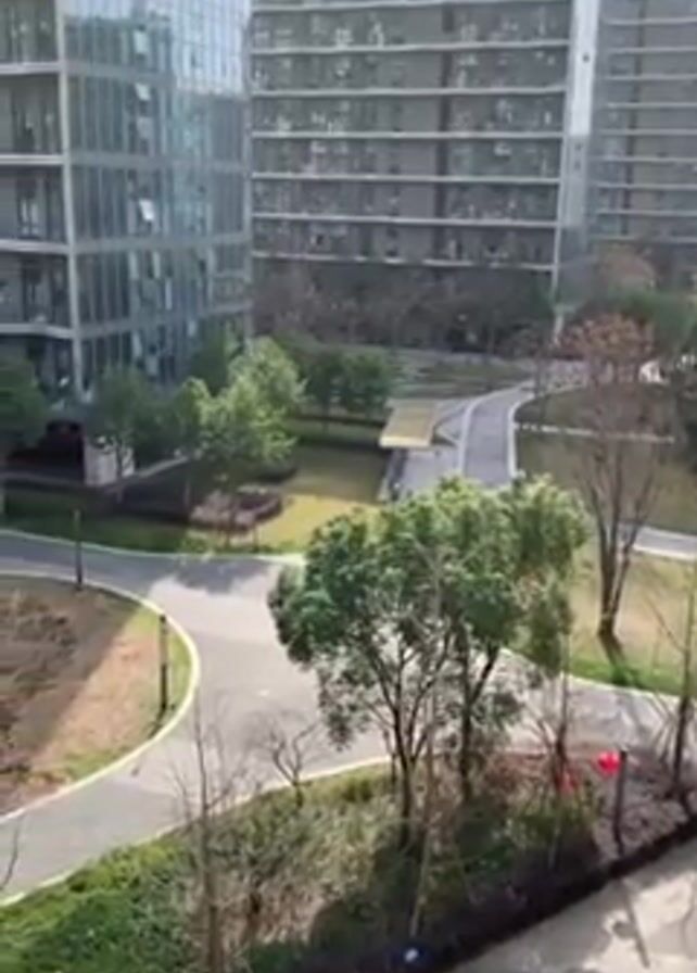 n elevated view of a modern, urban residential complex. There are multiple high-rise buildings visible, some with glass facades and others with gray exteriors featuring numerous balconies. Between the buildings is a well-maintained landscape with paved paths, green lawns, trees, and landscaped beds. The camera pans slowly to the right, revealing more of the complex and the surrounding area. The sky is overcast.