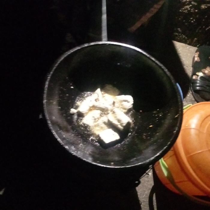 A black cast iron pot holds pieces of tofu frying in oil. The tofu is golden brown and bubbling in the oil. A dark shadow fills much of the frame, but a pair of sandals are seen on the right side of the image. A bright orange object is adjacent to the frying pot. The background is dark.