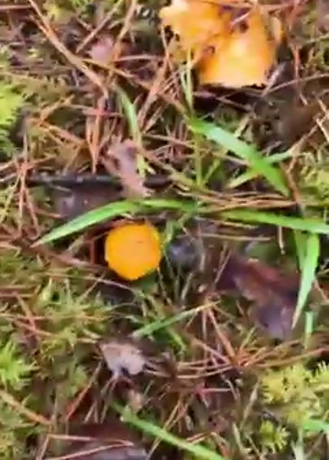 The camera rapidly scans over a forest floor covered in green moss, fallen pine needles, and patches of melting snow. Focus then settles on two small, bright orange mushrooms, partially surrounded by dried leaves and blades of grass. The camera moves again, showing the forest floor with its mix of textures, before returning to the mushrooms, providing a close-up view. The scene is natural, suggesting a damp or recently snowy woodland environment.