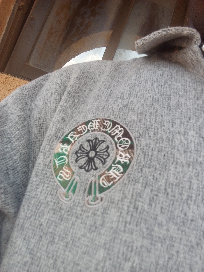 A close-up image captures the upper torso and left shoulder of an individual wearing a light grey, heathered knitted sweater in Oko Erin, Nigeria. The sweater features a prominent embroidered emblem on the left chest. This emblem is a U-shaped design with the words "CHROME HEARTS" rendered in an Old English font around the curve. The interior of the U-shape contains a camouflage pattern in green and brown tones, with a stylized black cross or fleur-de-lis motif centrally placed. The emblem is outlined with a light-colored border. In the background, a textured light brown wall is visible on the left. Above the individual's left shoulder, a segment of a dark brown or rust-colored structure, possibly a roof or awning, is present. A narrow strip of light blue sky with white clouds is visible through an opening between the structure and the sweater, indicating an outdoor or semi-enclosed environment.