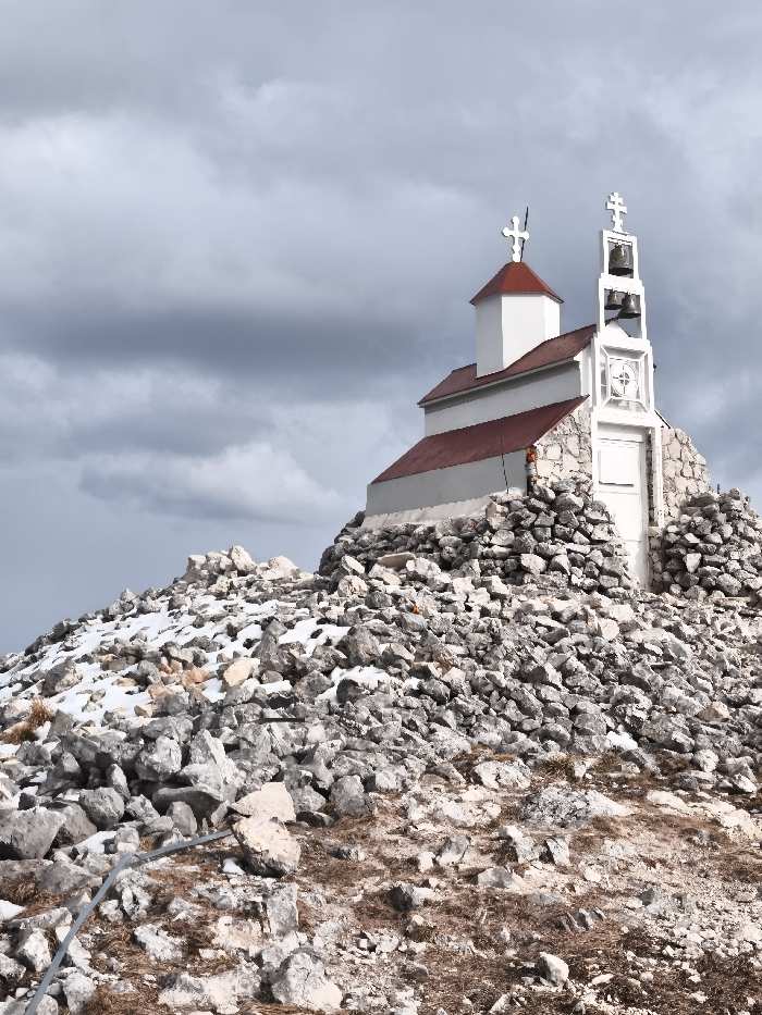 A white church with red roofs stands prominently on a rocky, snow-dusted mountaintop in Mali Mikulići, Montenegro, under an overcast sky