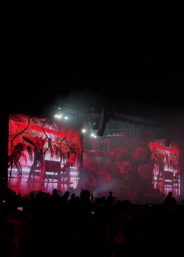 A concert crowd stands in silhouette, facing a stage with massive video screens displaying a surreal, reddish scene. The visuals include figures that appear to be human-like, surrounded by abstract shapes and structures reminiscent of vines or roots. Bright stage lights shine through the darkness, and smoke or fog partially obscures the view, adding to the atmosphere. The people in the audience are holding up their phones, presumably recording or photographing the performance.