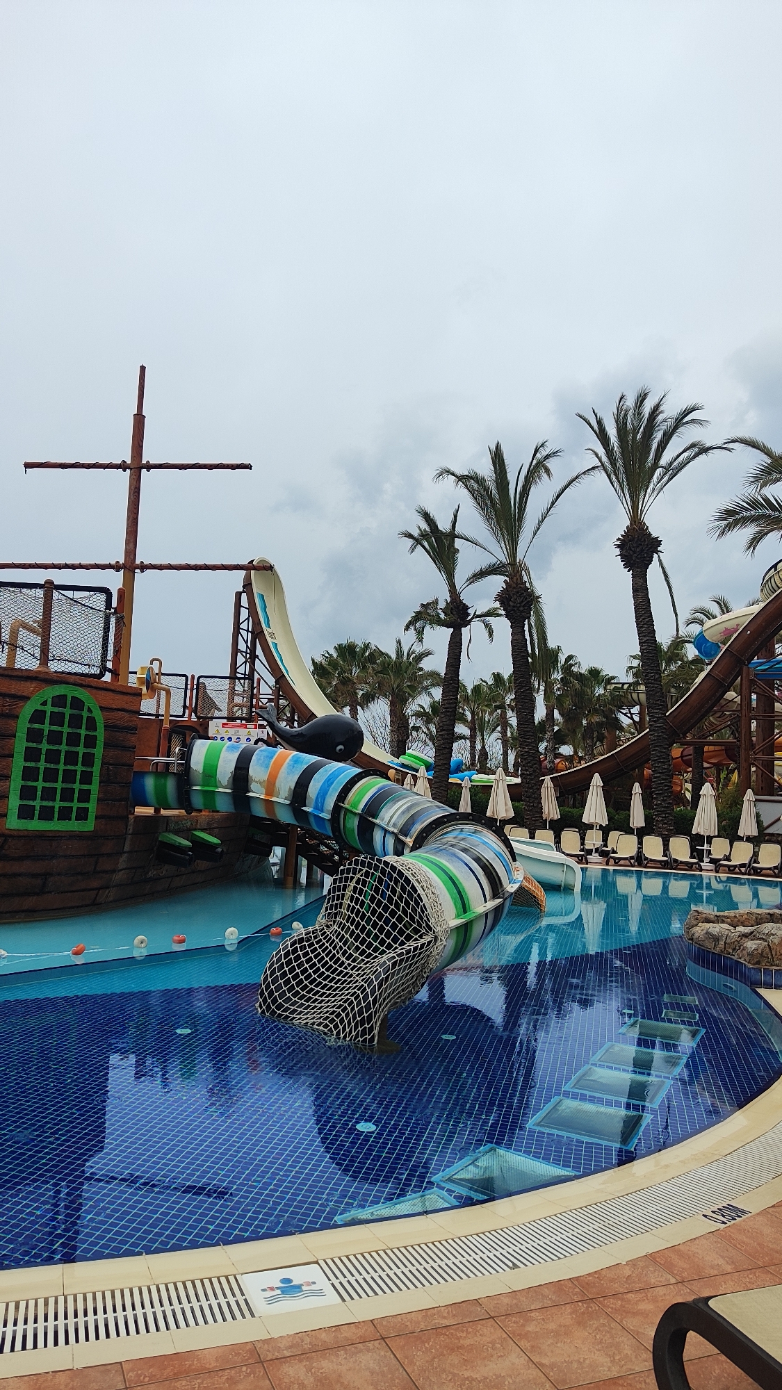 An outdoor waterpark facility is depicted under an overcast sky in Alanya, Turkey