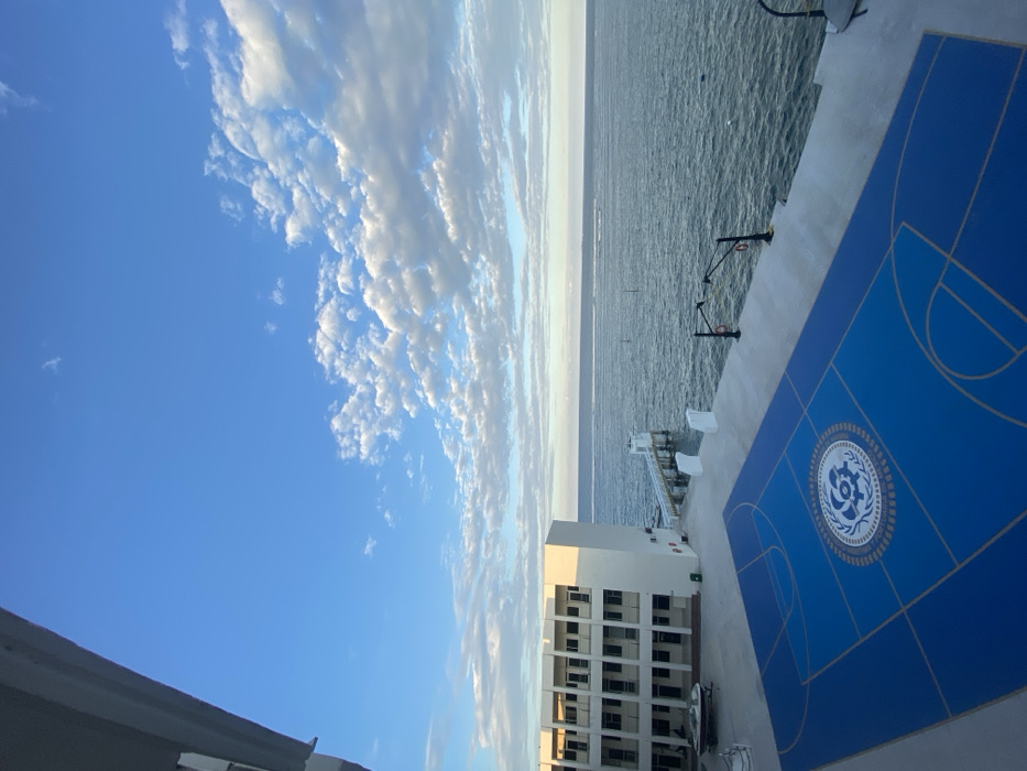 The image depicts an elevated view of the Heroica Escuela Naval Militar, located in Antón Lizardo, Veracruz City, Mexico, oriented towards the Gulf of Mexico. The scene is illuminated by either morning or late afternoon sunlight, casting warm light on structures. In the foreground, a vibrant blue outdoor basketball court occupies the concrete ground, featuring yellow boundary lines and a prominent circular emblem at center court. The emblem incorporates an anchor, a gear, and a wreath, representative of a naval or maritime institution. Two basketball hoops with black poles and orange rims, each equipped with a red-and-white life preserver, are positioned at the court's edge overlooking the water. To the left of the court, a multi-story, white building with numerous windows and balconies rises, showcasing a modern, functional architectural style. Adjacent to this building, a small white speedboat is visible, stored on a trailer on the concrete surface. Extending from the land into the calm, blue-green ocean is a concrete pier with white railings, terminating in a small white structure resembling a guard post or observation tower. Two large, white, wave-like sculptures are situated on the concrete near the pier's base. The background features the expansive ocean, showing subtle ripples on its surface, and a distant, lighter-colored band of water indicative of a reef or shallow area. The sky above is clear blue with scattered white cumulus clouds, becoming denser towards the horizon. No individuals are present, and no specific actions or interactions are depicted.