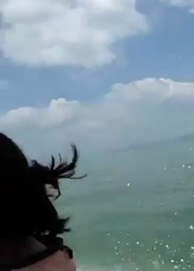group of people riding on a longtail boat in Thailand. Splashes of water spray near the camera. The boat has a colorful canopy. One person is wearing a life vest and looking at a large island. The island is covered in dense green vegetation. The water is a teal color, and the sky is blue with some clouds.