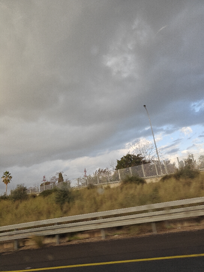 An outdoor, eye-level photograph taken from a moving vehicle depicts a highway scene under a heavily overcast, grey sky with a patch of lighter clouds visible on the right. In the foreground, a dark asphalt road surface with a single solid yellow line occupies the bottom portion. Immediately above the road, a silver metal guardrail (armco barrier) extends horizontally across the lower mid-frame, exhibiting slight motion blur. Behind the guardrail, a scrub-covered embankment with dry, yellowish-brown vegetation slopes upward, also showing motion blur. On the crest of the embankment, a clear fence structure, consisting of a solid lower base and translucent upper panels, runs horizontally across the scene. A solitary palm tree with green fronds stands prominently on the far left. Behind the fence, various trees and shrubs are visible, some appearing bare or sparsely foliated, others densely green. Multiple distinctive red and white striped cylindrical structures, consistent with industrial chimneys, are discernible above the tree line and fence, notably in the center-left portion of the background. A tall, thin streetlamp pole with a dark fixture at its apex is positioned on the right, extending upwards from behind the fence into the sky. No individuals are present. The scene is located along a highway within the Zvulun Regional Council, Israel, with the prominent red and white striped structures indicative of the industrial area of Haifa Bay, specifically the Haifa power station.