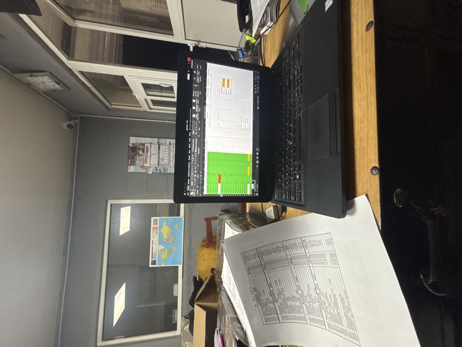 The image displays an interior view of a commercial or office space, specifically a desk area in Kardzhali, Bulgaria. The central focus is a black laptop computer positioned on a light wooden desk, its screen displaying an open spreadsheet application with data in columns, some cells highlighted in green and one in red. To the left of the laptop, a printed document with Cyrillic text and numbers, dated "20 / 02 / 2024" at the top and referencing "ДЕКЕМВРИ 2023" (December 2023) and "ЯНУАРИ 2024" (January 2024) with currency "ЛЕВ," rests partially crumpled on the desk. The background features a light gray wall with horizontal paneling. A large rectangular window, framed in white, occupies the upper left portion of the wall, reflecting interior fluorescent lighting. Below this window, a world map is taped to the wall. To the right of the map, a calendar is also affixed. A small, white security camera is mounted in the upper left corner of the wall, near the ceiling. Further to the right, a square wall clock with a white face and dark numerals is visible, positioned above a white-framed door or large window structure that leads to another area, with some light visible beyond. Cardboard boxes and other assorted items are present on a surface to the far left. No individuals are depicted. The lighting is artificial.