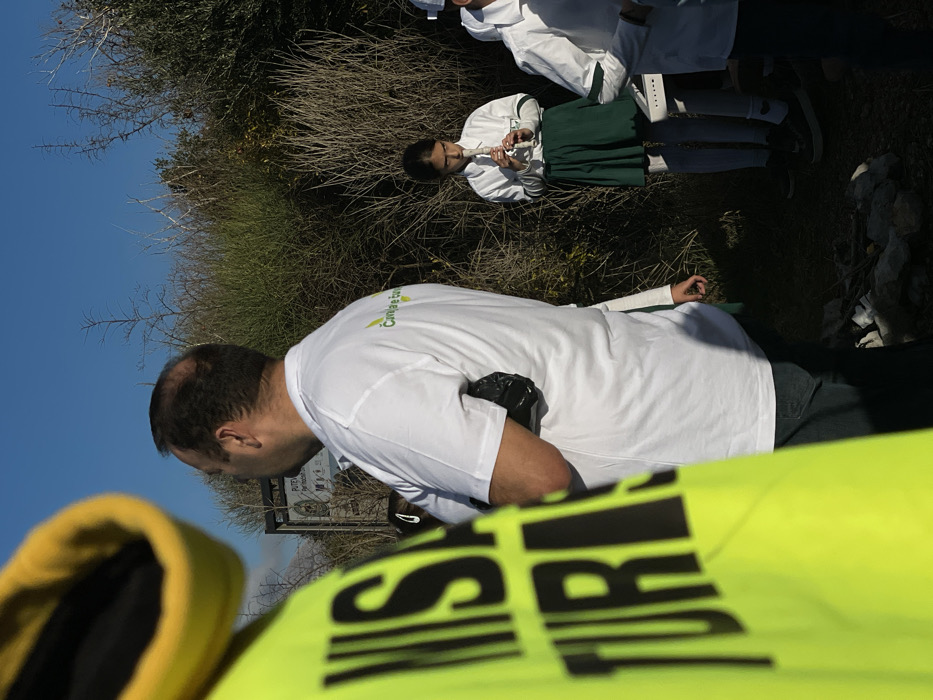 The image depicts an outdoor gathering in Dubravcevina, Montenegro, under a clear blue sky. In the immediate blurry foreground on the left, the back and left shoulder of an individual wearing a neon yellow hooded vest with black text, partially reading "NIS TURIST", are visible. Directly behind this individual, slightly to the right, stands a man with a receding hairline, seen from the rear right. He wears a white short-sleeved polo shirt with a green and yellow logo on the back, partially legible as "Čovječe Bu**", and dark trousers. A black item is tucked under his left arm. His gaze is directed towards the right side of the frame. To the right of the man, a young girl stands, playing a white recorder. She is dressed in a white long-sleeved shirt and a dark green pleated skirt. Her dark hair is pulled back. To her immediate right, another individual, partially visible, wears a white long-sleeved garment with green trim and holds or stands near a white rectangular object, possibly a small keyboard or electronic device. The background consists of dense, dry-looking green and brown bushes and scrubland, with some taller, sparse branches extending upwards. Behind the man, a dark signpost with a white informational sign is partially visible, showing text that includes "PUTEVI" (Roads) and "Parohija" (Parish). The ground in the foreground and midground is dirt, interspersed with dry vegetation and several small rocks. In the lower center, directly in front of the man, there is an area of disturbed ground with some debris, possibly ash, surrounded by rocks, suggesting a small fire pit. The scene is illuminated by natural sunlight, casting shadows.