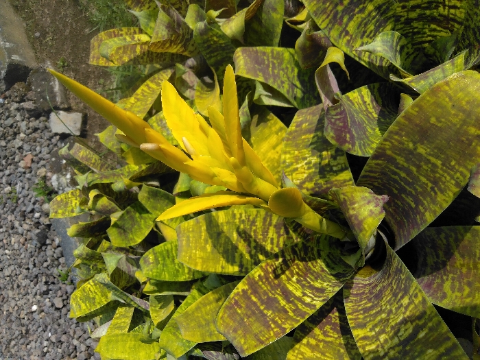 An upward-angled, close-up photograph depicts a variegated bromeliad plant located in the city of České Žleby, Czechia. The plant features a central rosette of broad, strap-like leaves, distinctively marked with irregular bands of bright yellow-green and dark greenish-brown. An erect, spear-shaped inflorescence, uniformly bright yellow, emerges from the rosette's center. This inflorescence displays multiple smaller yellow bracts with nascent lighter-colored floral structures. Strong, direct sunlight illuminates the plant, creating defined shadows on the foliage. The background comprises coarse dark grey gravel, with a small patch of green vegetation and a concrete-like edge visible in the upper portion.