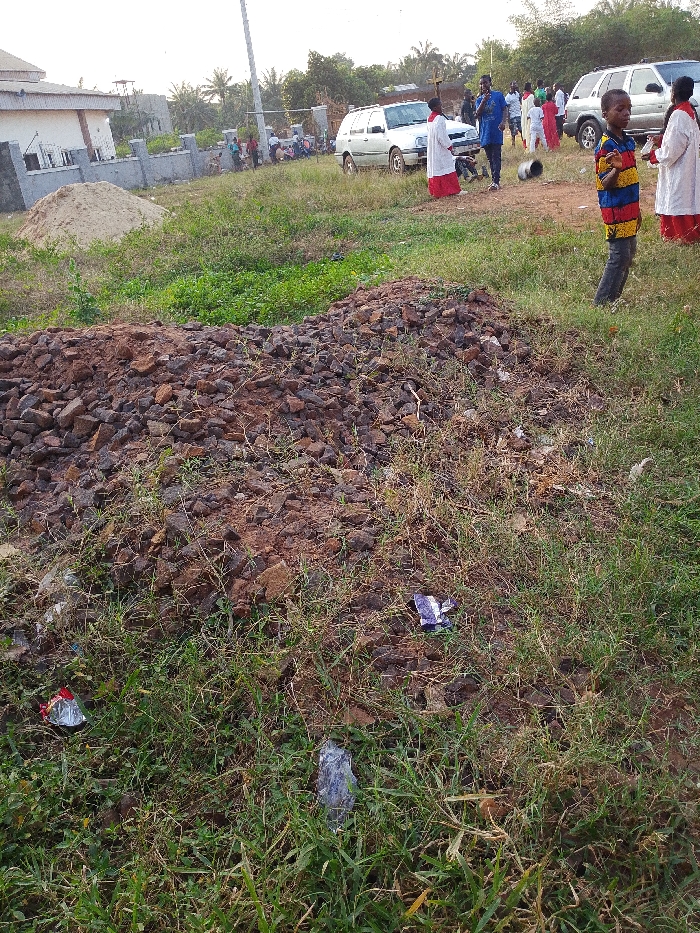 The image displays an outdoor scene in Enugwu-Ukwu, Nigeria, featuring an open, unpaved area. The foreground consists of uneven terrain covered by sparse green and dry brown grasses, with several discarded foil and plastic wrappers visible as litter. A prominent pile of dark brown and reddish-brown fractured rocks or rubble occupies the central-left foreground. In the midground, a group of approximately 10-15 individuals is present, along with two parked vehicles. On the right, a young male child, approximately 6-10 years old, stands looking towards the camera, wearing a multi-colored horizontal striped shirt (yellow, red, blue) and dark pants. Behind him, two adults wear white religious vestments with red sashes; one holds a metallic processional cross with a figure, while the other holds a small metallic vessel. A white minivan or SUV is parked in the midground-left, with a silver SUV further back on the right. Several other individuals, dressed in casual clothing, are standing near the vehicles; one person in a blue shirt is speaking on a mobile phone. A dark, cylindrical object lies on the ground near the white vehicle. The background on the left reveals a light-colored building under construction with a grey perimeter wall and an adjacent pile of light-colored sand. Further into the background, additional buildings, dense green foliage, and palm trees are visible under a bright, hazy sky. A tall utility pole extends vertically in the upper left-center of the frame.
