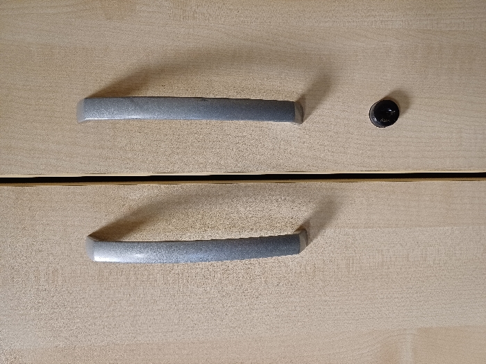 The image displays a head-on, close-up view of two closed, light-colored wooden or wood laminate cabinet doors. A dark, vertical seam separates the left and right doors. Each door features a vertically oriented, rectangular metallic handle with a silver-grey, textured finish. Both handles are positioned in the upper central portion of their respective doors. On the right door, a circular black lock cylinder with a horizontal keyhole is centrally embedded below its handle, positioned closer to the central seam. Illumination appears to originate from the upper left, casting subtle shadows to the lower right of each handle and the lock cylinder. No individuals, actions, interactions, or external environmental elements are visible. The image does not contain any visual information identifying the location as Grevenmacher, Luxembourg.