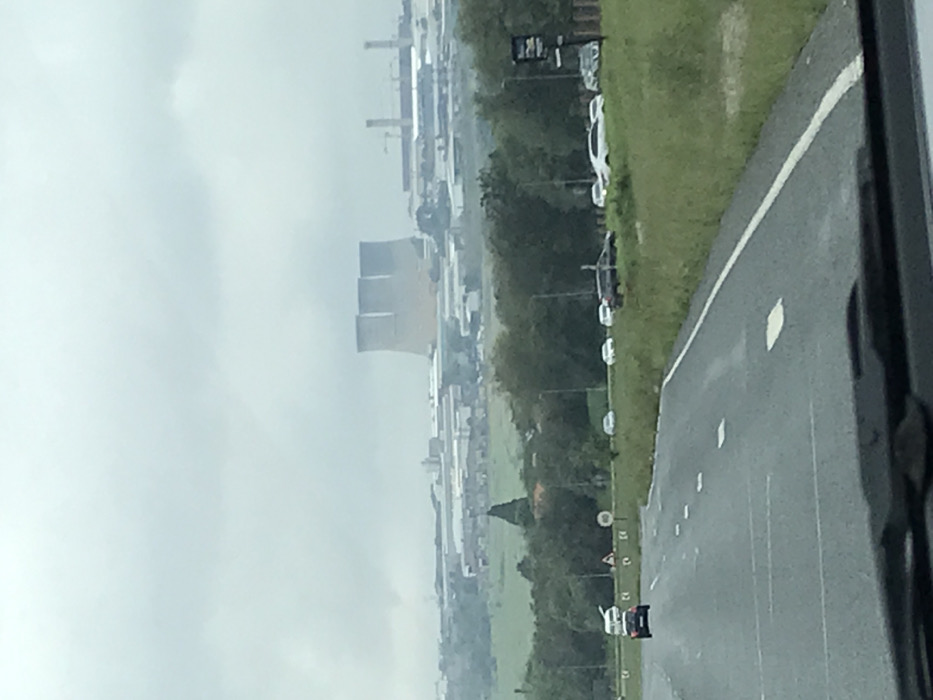 A highway stretches into the distance, wet from rain. A grass verge borders the road, lined with parked cars and intermittent trees. In the distance, a cluster of cooling towers, possibly part of a power plant or industrial complex, stands tall against a hazy sky. Buildings and industrial structures surround the base of the towers, contributing to the urbanized landscape. The overall atmosphere is overcast and somewhat bleak.
