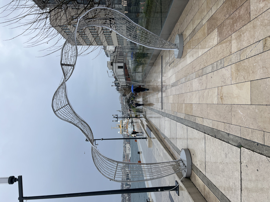 This image captures a waterfront promenade in Beyoğlu, Turkey, under an overcast sky, with surfaces reflecting moisture from recent rain. The scene is dominated by a series of artistic, wave-like skeletal arches crafted from silver-toned metal strips, stretching down the promenade from the foreground. The closest arch on the left rises from a circular base. A tall, black lamppost with a cylindrical light fixture stands prominently on the far left in the foreground. The promenade paving consists of light beige and brown rectangular stone tiles laid in a staggered pattern on the right side, and lighter grey/beige rectangular slabs on the left closer to the water. All surfaces are visibly wet and reflective. A dark grey linear drain runs between the two paving styles. To the left, a low, light-colored concrete wall separates the promenade from the water, which appears dark blue-grey. Further down this side, several dark bollards are visible, and long, light-colored stone benches are placed along the wall. In the midground, a large white passenger ferry with yellow trim is docked at the waterfront. Beyond the water, distant hills are covered with buildings under the grey sky. Several individuals are walking along the promenade from the foreground towards the background. One person in the mid-right is walking away from the camera, holding an open blue umbrella, indicating current or very recent precipitation. Other figures are visible further down the path. On the immediate right side of the promenade, behind a transparent barrier, there are modern multi-story buildings featuring glass facades and horizontal architectural elements, interspersed with older, light-colored buildings further in the distance. Bare tree branches are visible near the building on the right.