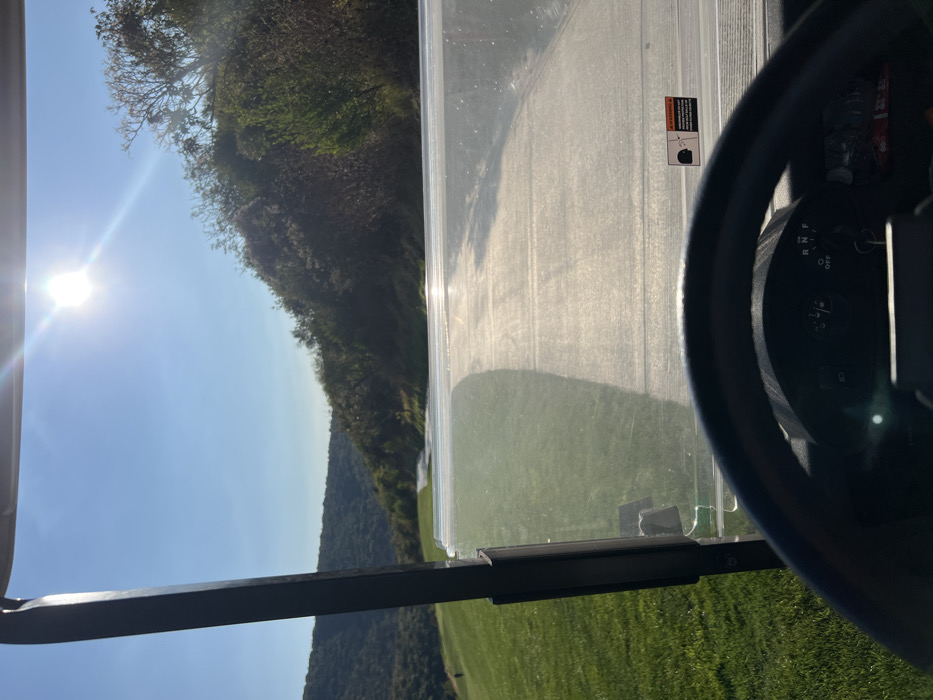 The image depicts a golf course view from inside a golf cart. The sun shines brightly above green trees and grassy hills visible through the windshield. The cart's frame, steering wheel, and dashboard controls are partially visible in the foreground. A safety warning sticker is affixed to the windshield.