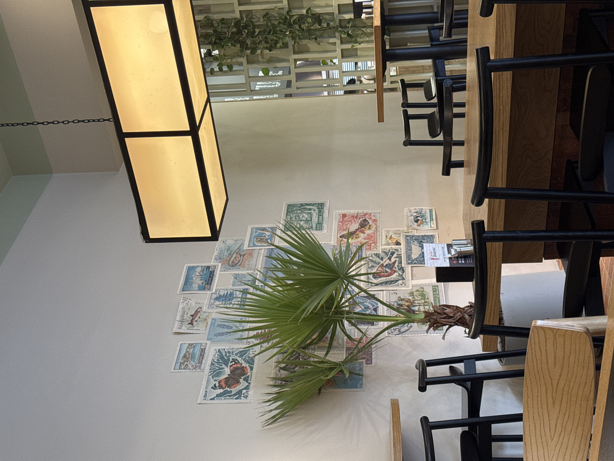 interior of a restaurant in Yerevan, Armenia. The perspective is from a low angle, looking toward a wall decorated with an array of vintage postage stamps, primarily of Armenian origin, suggesting a thematic design choice. A small potted palm plant is positioned in front of the stamps, adding a touch of greenery to the scene. The restaurant's seating arrangement features wooden tables and black chairs, organized in rows. A large, rectangular light fixture hangs from the ceiling, providing illumination. The overall ambiance suggests a modern aesthetic, blending local cultural elements with contemporary design.