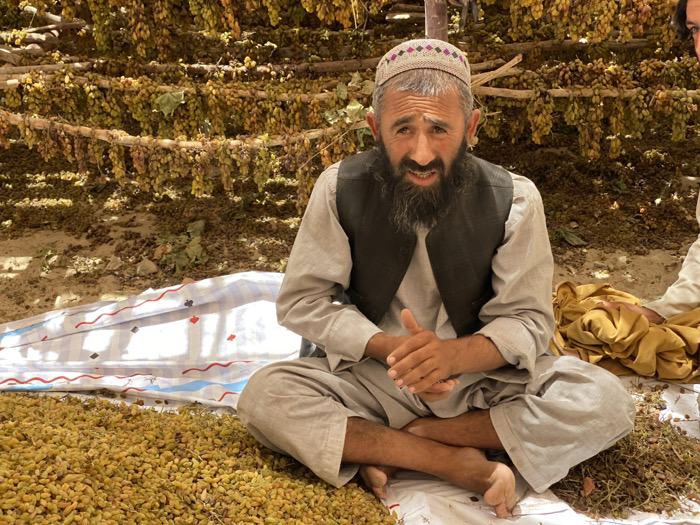 The scene depicts an outdoor grape drying operation in Bazar-e Panjva'i, Afghanistan