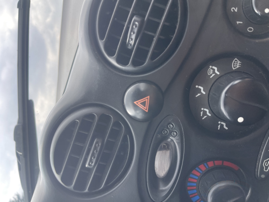 The image displays the interior dashboard of a vehicle, viewed from a slightly elevated, front-facing perspective. No specific details are present to confirm the location as Ignatievo, Bulgaria. The upper section of the dashboard features two circular air vents, one on the left and one on the right, each with horizontal slats and a four-dot selector at its center. Positioned centrally between these vents is a circular black button marked with a red triangular hazard symbol. Above these elements, a portion of the windshield and a single wiper blade are visible, with an overcast, light gray sky in the background. Below the left air vent, an oblong panel contains a recessed, possibly reflective, surface and four small circular buttons arranged in a square pattern. Adjacent to this, in the lower left, a circular knob displays red and blue segments, indicative of a temperature control. To its right, a larger circular knob features icons representing various air direction settings (e.g., face, feet, windshield defrost) and is currently set to an intermediate position. A smaller, partially visible circular knob to the far right shows numerals "0, 1, 2," suggesting a fan speed control. No individuals or actions are depicted in the scene.