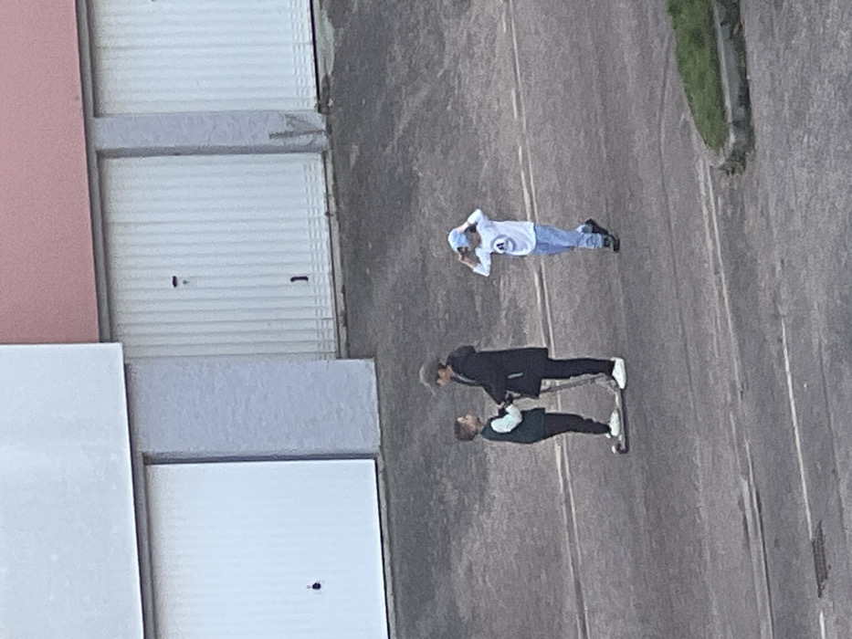 The image depicts an outdoor scene in the city of Strasbourg, France, featuring three individuals on an asphalt surface in front of a building with multiple garage doors