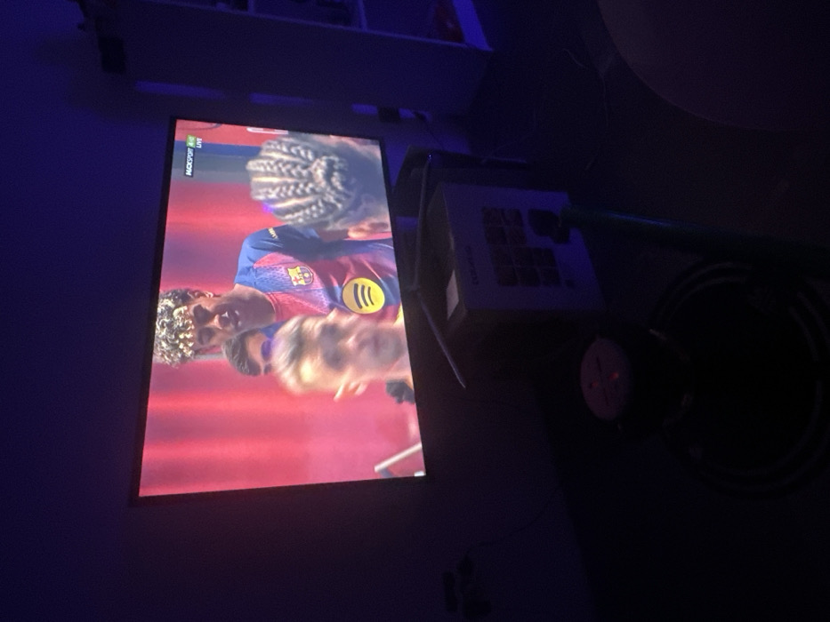 This image displays a dimly lit indoor scene, likely a private residence in Sofia, Bulgaria. The central focus is a wall-mounted television screen exhibiting a live sports broadcast, identifiable by the "MAXSPORT LIVE" logo. The screen shows multiple male individuals in what appears to be a football event, set against a reddish-pink background. One prominent figure, with curly light-brown hair, wears an FC Barcelona jersey featuring the Spotify logo. Other figures include a partially visible male face to his left and a blurred male head in the foreground, along with the back of a head with cornrow braids on the right side of the screen. In the lower foreground, a dark-colored hookah or shisha device is visible, distinguished by a small red glowing light on its top, with a dark hose extending horizontally from it. Adjacent to the hookah on the right, a light-colored cardboard box with grid-like graphics is present. The room is characterized by low light levels with a distinct blue ambient hue emanating from an unseen source, possibly strip lighting. A white shelving unit is partially visible on the far right. No individuals are visible within the room itself, only the objects and the illuminated television screen.