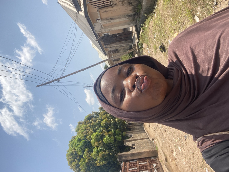 The image depicts a young female posing for a selfie on an unpaved residential street in Zango-ndaji, Nigeria