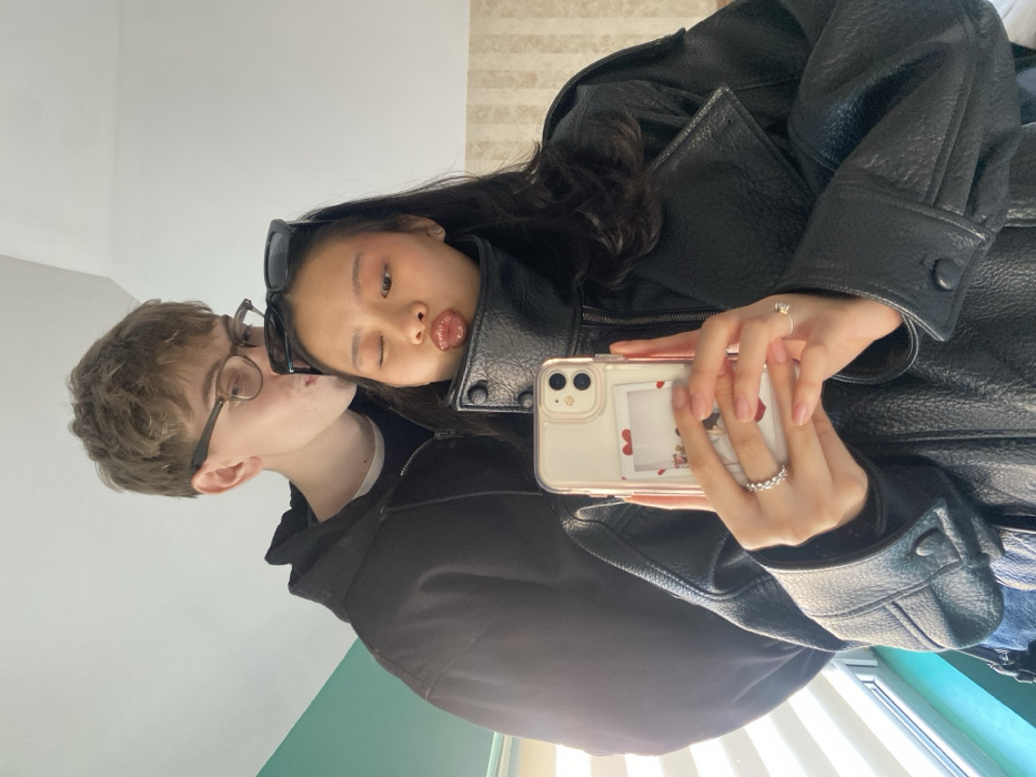 Two individuals, one female and one male, are captured in an indoor mirror selfie. The scene is located within a room in Plovdiv, Bulgaria, characterized by a teal-colored wall segment and horizontal window blinds on the left, and a striped wallpapered wall on the right. The female, positioned in the foreground and appearing of East Asian ethnicity, has long dark hair and wears a black leather-look jacket with a prominent collar. Black sunglasses are perched on her head. Her left eye is closed in a wink, and her lips are pursed in a "kissing" gesture, coated with gloss. She holds a light-colored iPhone, equipped with a clear case featuring a decorative insert displaying red hearts, with both hands. A textured ring is visible on her left ring finger, and a simple ring on her right. Behind her and to her left, a male individual, appearing of Caucasian ethnicity, has light brown curly hair and wears eyeglasses. He is dressed in a dark zippered hoodie over a lighter-colored shirt. His head is tilted towards the female's head, and his lips are slightly pursed, indicating a playful kissing gesture. Illumination is consistent throughout the visible space.