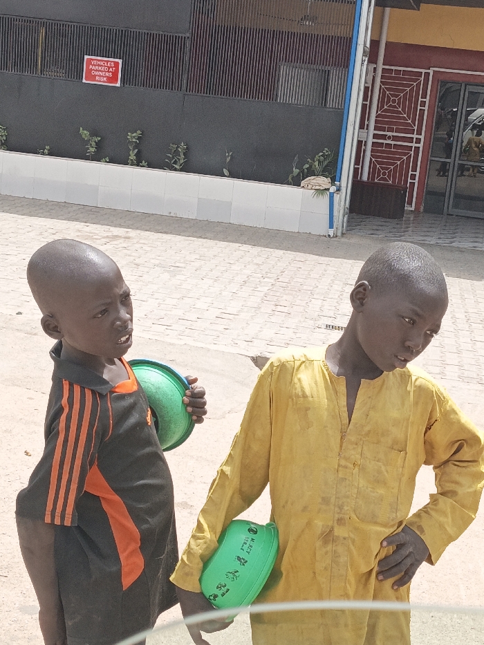 Two young males, appearing to be children, are depicted standing outdoors in Hotoro, Nigeria, during daylight hours. The subject on the left wears a black short-sleeved shirt with orange vertical stripes on the sleeves and holds an empty green plastic bowl in his left hand, looking slightly upwards and left with his mouth open. The subject on the right, slightly taller, wears a soiled yellow long-sleeved garment and holds a green plastic bowl with "M.B.C.Y. U.S.M.A." text in his left hand, looking downwards and to the right. Both individuals have short, dark hair. They stand on a surface comprising light-colored interlocking pavers mixed with bare dirt patches. In the background, to the left, is a dark grey building facade with vertical slats, a white low wall, and sparse vegetation. A red sign is affixed to this building, reading "VEHICLES PARKED AT OWNERS RISK." To the right, an adjacent building displays a red and yellow facade, featuring a doorway with a decorative metal security grate and reflective glass, showing a partial, blurred reflection.