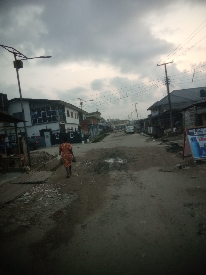 A street scene under a cloudy sky shows a dirt road riddled with potholes. A woman in a patterned dress walks away from the camera. Buildings line both sides of the street, with a mix of older, wooden structures and newer, two-story buildings. Utility poles and wires run overhead. A sign is visible on the right side of the road. A vehicle is parked further down the street. The overall impression is one of a somewhat impoverished or developing area.