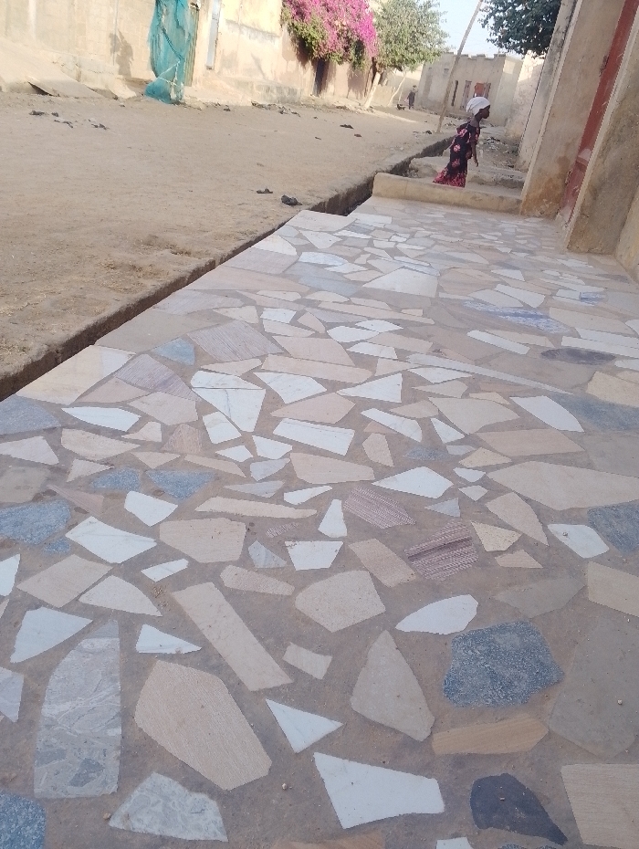 The scene depicts an outdoor urban environment in Panshekara, Nigeria, under daylight conditions. The foreground features a light-colored, irregularly patterned terrazzo-style pavement composed of various natural stone fragments embedded in a cement matrix. This paved area abuts a shallow, linear drainage ditch, which separates it from an unpaved dirt road extending into the midground and background. To the right of the paved area, a light-colored building wall with a reddish-brown vertical element is visible. In the midground, a single individual, appearing as a child or short adult, stands on a low concrete step adjacent to the tiled pavement, positioned between the pavement and the dirt road. This individual wears a dark, patterned dress and a light-colored head covering, facing generally towards the left. The background consists of several low-rise buildings constructed from light-brown or beige materials, bordering the dirt road. A vibrant pink flowering bush is attached to a building wall on the left side of the dirt road. Further down the road, another less distinct human figure is visible. Sparse trees and a blue net-like object hanging on a building are also discernible in the background.