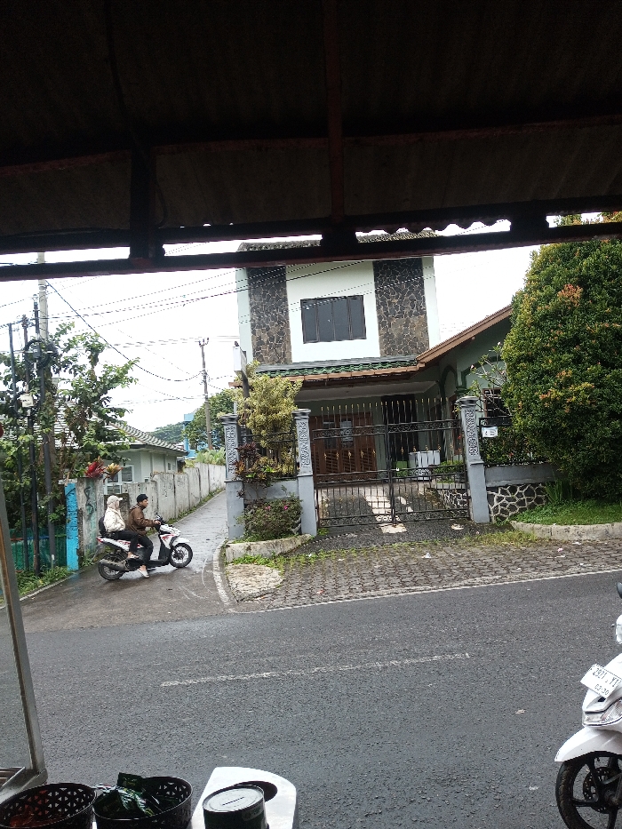 The image depicts a street scene in Cipendawa, Indonesia, viewed from beneath a dark corrugated roof structure. In the immediate foreground, partial views of two dark woven baskets, a lidded white container, and the front wheel and fairing of a white scooter (license plate D 3927 YTI 03-26) are visible. An asphalt road with faint white markings extends across the mid-ground. On the left side of the road, two individuals ride a white scooter at the mouth of a concrete alleyway; the male driver wears a brown jacket, and the female passenger a light headscarf and jacket. Across the road, a two-story residential house is prominent, featuring a lower ornate dark metal gate flanked by decorative grey pillars and a patterned stone driveway. The upper story has a light-colored facade with dark stone cladding on either side of a large dark-framed window. A green-tiled section covers the lower entrance. Dense green foliage flanks the house. The alleyway on the left extends past a concrete wall, revealing further residential buildings and utility poles with numerous power lines against an overcast sky.