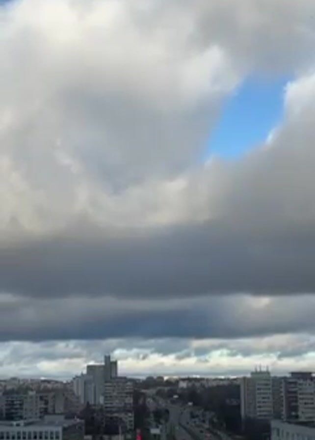 The video presents a high-angle shot of a cityscape under a cloudy sky. Predominantly gray clouds fill most of the frame, but there is a small patch of blue sky visible through a break in the cloud cover. Below the clouds, the city is composed of buildings of varying heights, mostly residential, stretching across the horizon. A highway runs through the center of the city, with cars moving along it. The buildings are typical of urban architecture, and the overall scene gives a sense of a moderately populated urban area under overcast conditions.