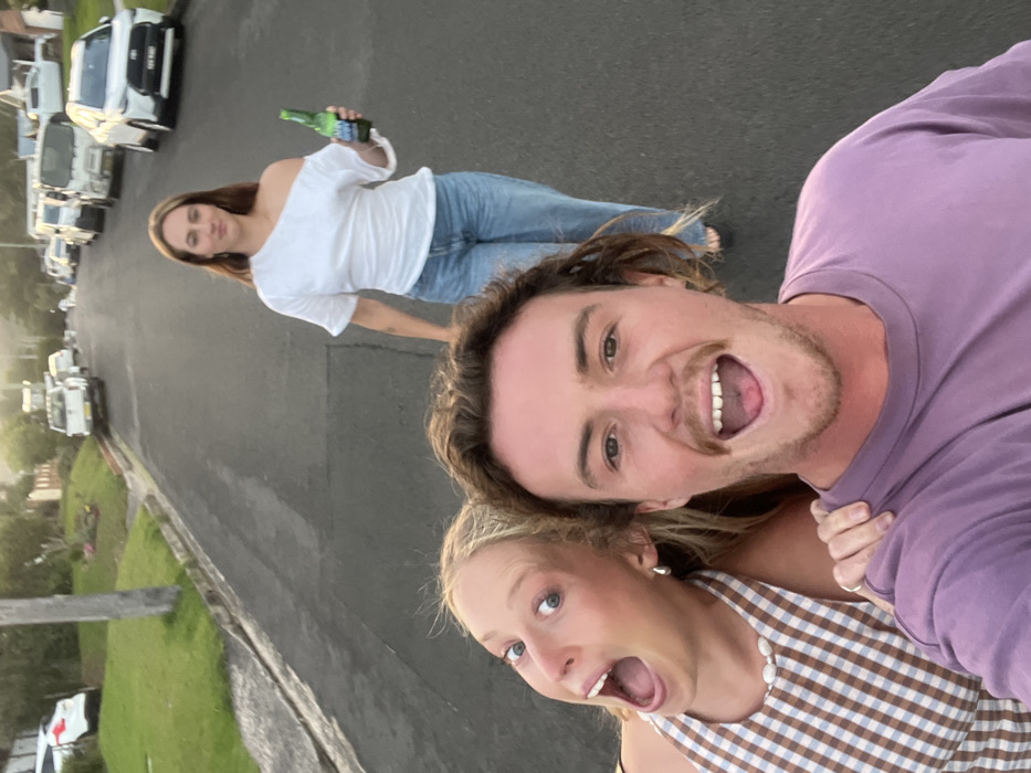 Three individuals are captured in a selfie-style photograph on a residential street in Thirroul, Australia, under late afternoon or early evening lighting conditions
