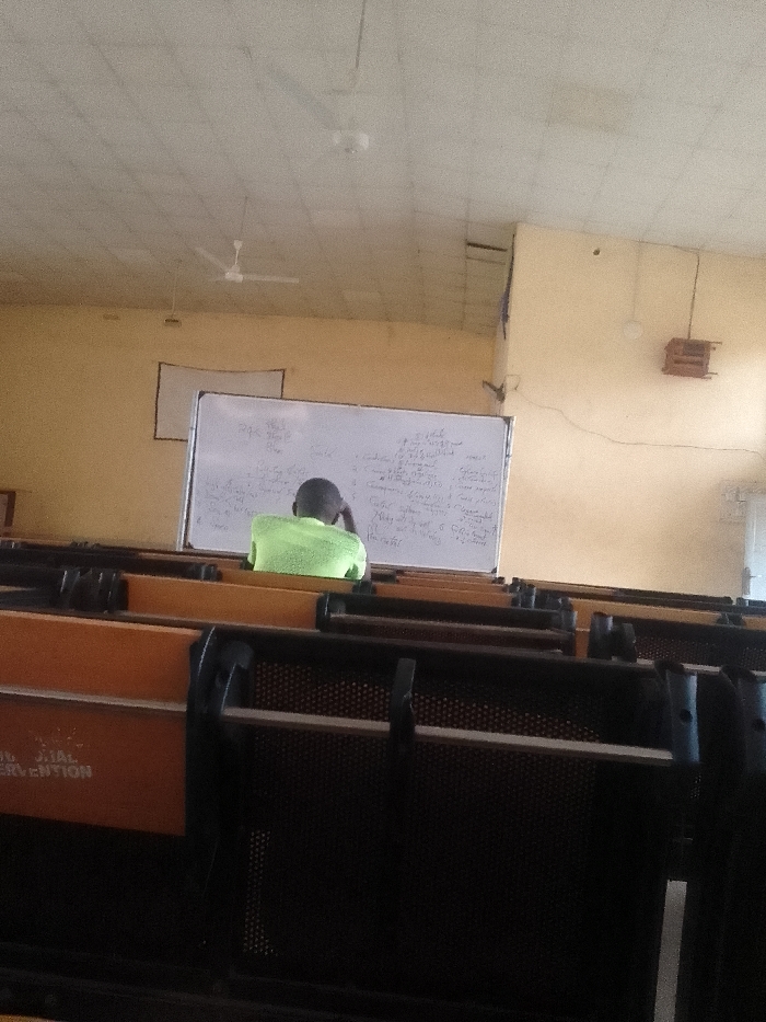 A student in a green shirt sits alone in a lecture hall, facing a whiteboard covered in writing