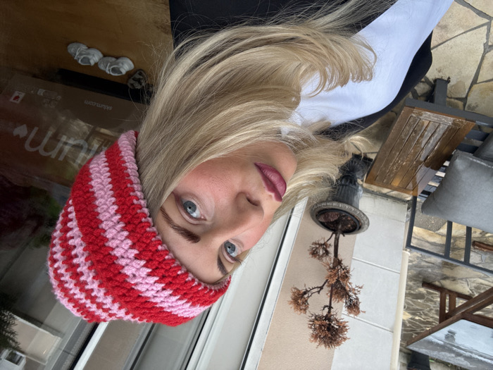 - "The image depicts a blonde-haired female subject wearing a red and pink horizontally striped knit beanie, dark jacket, and white undershirt, looking directly at the camera with blue eyes and dark lipstick" by FM-OZmdD3, licensed under CC BY 4.0