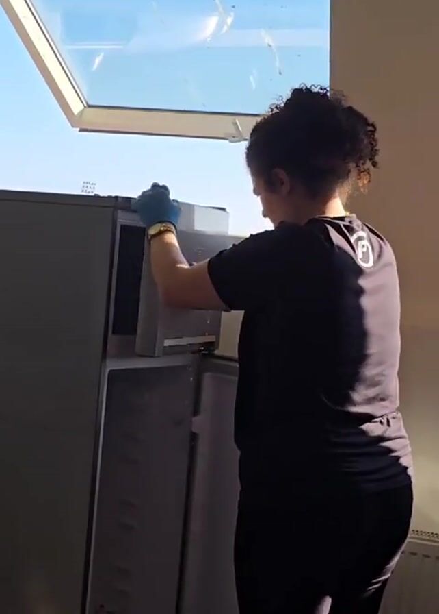 - "A woman with curly hair pulled back, wearing blue gloves and a black t-shirt with a white logo, is cleaning the top of a refrigerator next to a window" by FM-dTRWD3, licensed under CC BY 4.0