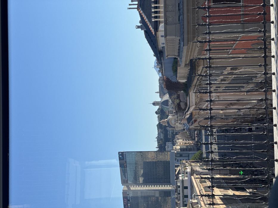 An elevated, eye-level photograph captures an urban panorama of Genoa, Italy, under a clear, bright blue sky, likely taken through a window due to faint reflections visible in the upper left. The foreground features a dark, ornate wrought-iron railing with pointed finials, spanning the lower portion of the frame. Beyond the railing, the scene extends over a city street. To the left, two prominent modern glass skyscrapers are visible; the left-most tower displays "do MAR" on its facade, and a structure behind it features a "WX" logo, identifying them as part of the World Trade Center complex in Genoa. A thoroughfare, possibly Via Antonio Cantore or a parallel street, recedes into the distance, flanked by multi-story buildings exhibiting traditional Italian architecture with balconies and varying facades. Further along this street, a large, dark dome of a historic structure, consistent with a church, rises above the surrounding buildings. A green traffic light is visible on the left side of the street, and faint vehicular and pedestrian traffic is discernible below. To the right, historic buildings with pitched roofs and multiple chimneys are present, some with rooftop vegetation. In the background, green, tree-covered hills transition to a distant, faint snow-capped mountain peak under the unobstructed sky. A faint aircraft contrail is visible in the upper left quadrant of the sky.