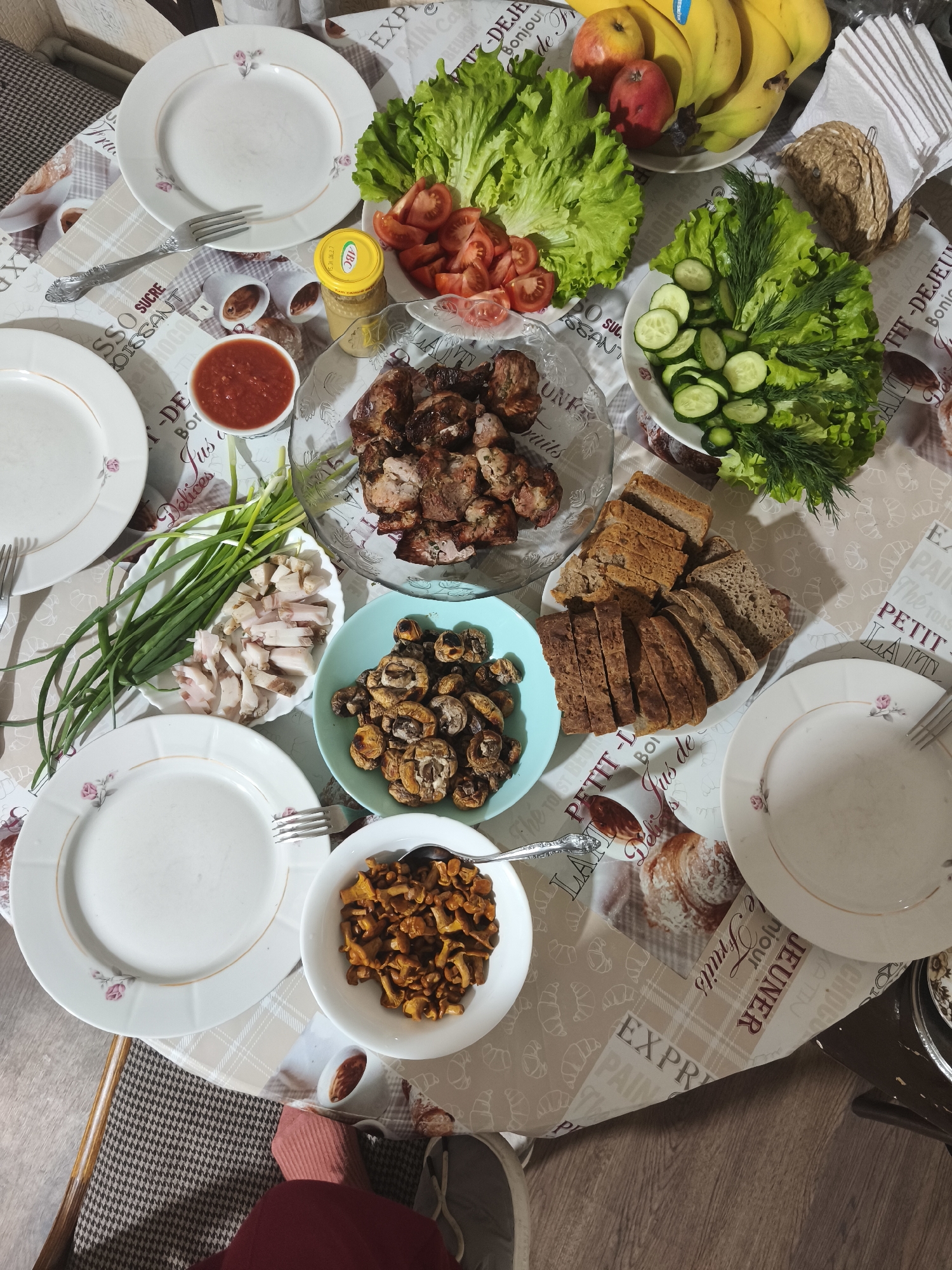 Here is a detailed description of the image: **Scene:** A tabletop laden with food, set in what appears to be a domestic setting, possibly a home dining area. **Location:** Likely in Парэчча, Belarus, based on image context. **Subjects and Objects:** * **Food:** A wide variety of food items are arranged on the table. These include: * Cooked meat (possibly shashlik or similar) in a glass bowl. * Fresh greens (lettuce, dill). * Sliced tomatoes and cucumbers. * Sliced green onions and lard. * Several types of cooked mushrooms in two separate bowls (one blue, one white). * Sliced bread. * Bananas and apples on a plate. * Condiments: Red sauce, and a yellow jar of mustard. * **Tableware:** * Several white plates with floral patterns, each with a fork. * A spoon in one of the bowls of mushrooms. * **Table covering:** A tablecloth with a pattern featuring images of croissants and French text. * **Background and Surroundings:** * A floor and what might be the legs and feet of a person are visible. * A chair with a patterned cushion. **Actions and Interactions:** * The scene is set for a meal. There is an arrangement of dishes and food suitable for multiple people. **Environment:** * The lighting appears to be natural. **Overall Impression:** The image captures a table set for a meal with a spread of traditional foods in a home setting in Belarus. The scene suggests abundance and a gathering around the table.