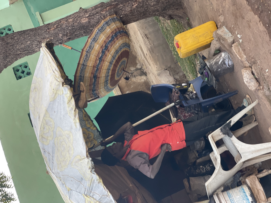 This image, taken in Muchiya, Nigeria, depicts an outdoor scene under what appears to be a makeshift stall or shaded area